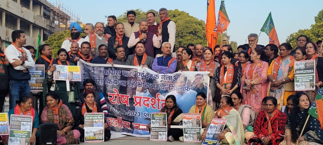 भारतीय जनता पार्टी ने कांग्रेस के राज्यसभा सांसद धीरज साहू के परिजनों का ठिकानों से आयकर विभाग द्वारा 250 करोड रुपए से अधिक काले धन की बरामदगी के बाद काले धन के खिलाफ स्थानीय सेक्टर 17 स्तिथ नीलम सिनेमा के पास रोष प्रदर्शन किया व कांग्रेस का पुतला फूंका।