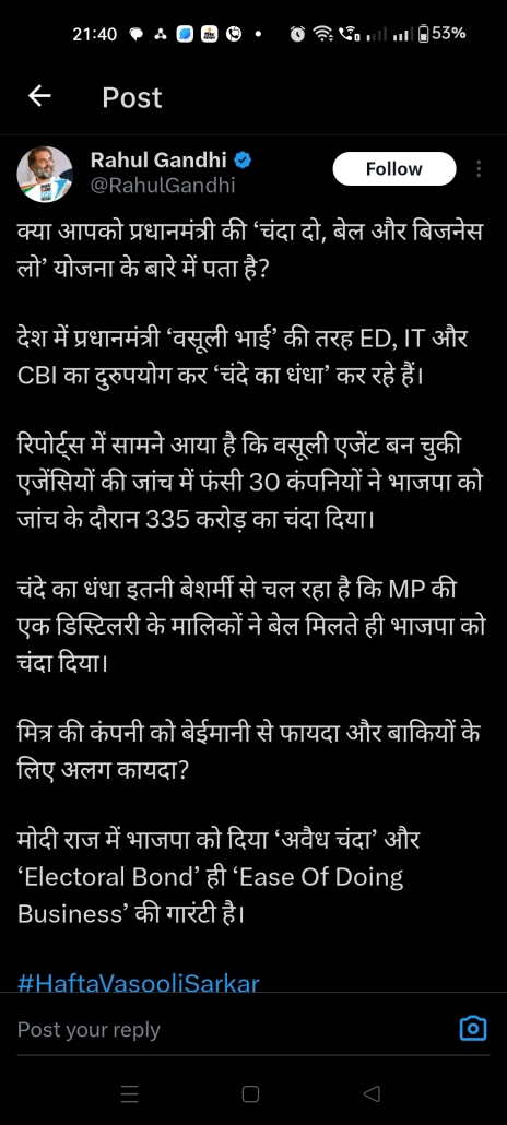 वहीं कांग्रेस के पूर्व अध्यक्ष राहुल गांधी ने सोशल मीडिया अकाउंट एक्स पर लिखा कि क्या आपको प्रधानमंत्री की चंदा दो, बेल और बिजनेस लो, योजनाओं के बारे में पता है। देश में प्रधानमंत्री वसूली भाई की तरह ईडी सीबीआई का दुरुपयोग कर चंदे का धंधा कर रहे हैं। रिपोर्ट में सामने आया है की वसूली एजेंट बन चुकी एजेंसियों की जांच में फसी 30 कंपनियों ने भाजपा को जांच के दौरान 335 करोड़ का चंदा दिया। चंदा का धंधा इतनी बेशर्मी से चल रहा है कि मध्य प्रदेश की एक डिस्टलरी कंपनी के मालिकों ने बेल मिलते ही भाजपा को चंदा दिया। मित्र की कंपनी को बेईमानी से फायदा और बाकियों के लिए अलग कायदा। मोदी राज्य में भाजपा को दिया अवैध चंदा और इलेक्ट्रोल बॉन्ड ही इसे ऑफ डूइंग बिजनेस की गारंटी है।