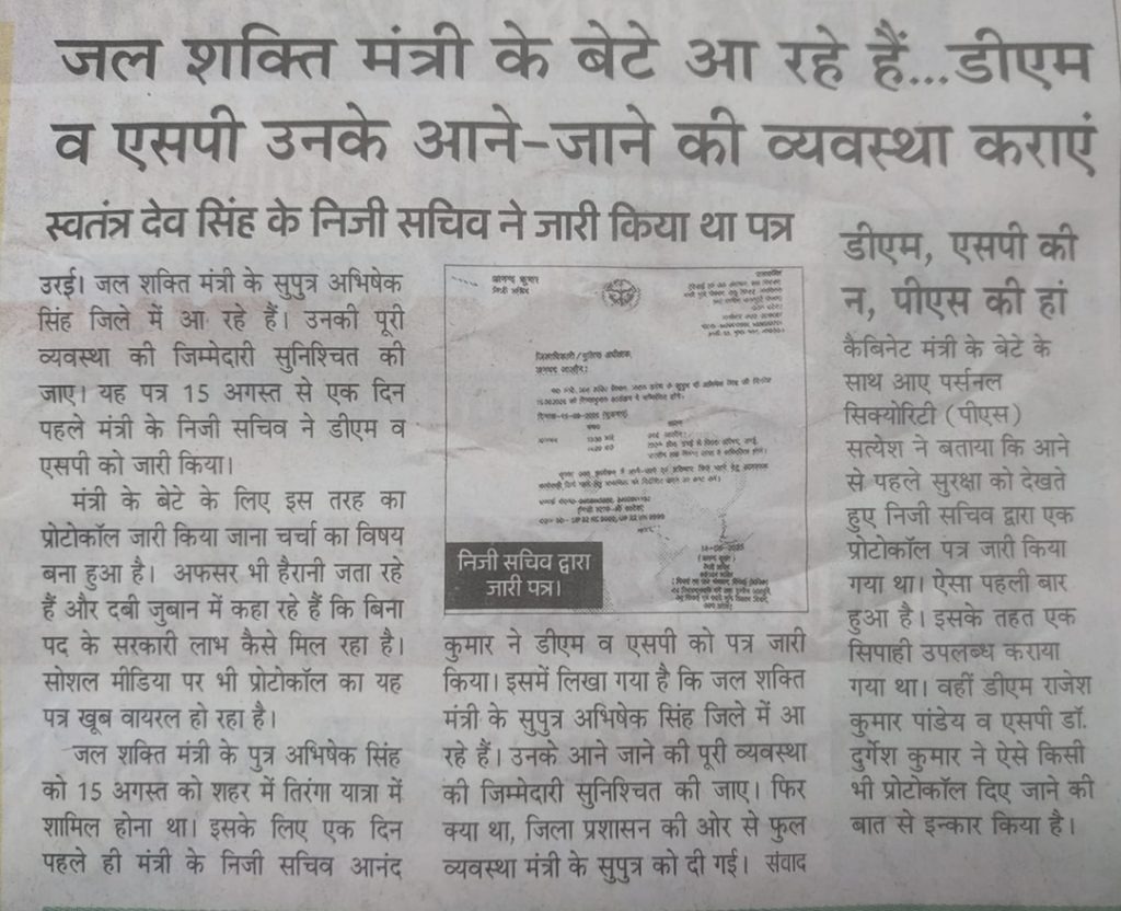 उत्तर प्रदेश के जलशक्ति मंत्री स्वतंत्र देव सिंह के पुत्र अभिषेक सिंह के लिए जिला प्रशासन द्वारा जारी कथित प्रोटोकॉल पत्र को लेकर नया विवाद खड़ा हो गया है। सोशल मीडिया पर सामने आए इस पत्र में जालौन और उरई के अधिकारियों को निर्देशित किया गया कि मंत्री पुत्र के आगमन पर संपूर्ण व्यवस्था सुनिश्चित की जाए।