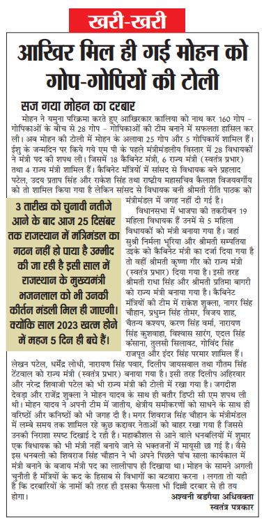 *मोहन के सामने अगली चुनौती है मंत्रियों के कद के हिसाब से विभागों का बटवारा करना । लगता तो यही है कि दरबारियों के नामों की तरह ही इसका फैसला भी दिल्ली दरबार से ही तय होगा।*