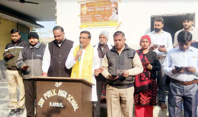 रेणू जैन/मीनाक्षी वालिया, करनाल,23 दिसम्बर : विश्व भर में अंतर्राष्ट्रीय गीता महोत्सव धूमधाम के साथ मनाया गया। इस कड़ी में शहर के शिव कॉलोनी क्षेत्र में स्थित शिव हाई स्कूल में 850 विद्यार्थियों ने ठीक 11 बजे एक साथ गीता के तीन श्लोकों का उच्चारण कर विश्व रिकॉर्ड बनाने में भाग लिया। हरियाणा राज्य सफाई कर्मचारी आयोग के वाइस चेयरपर्सन आजाद सिंह ने स्कूल के विद्यार्थियों को गीता के तीनों श्लोकों का उच्चारण करवाया।