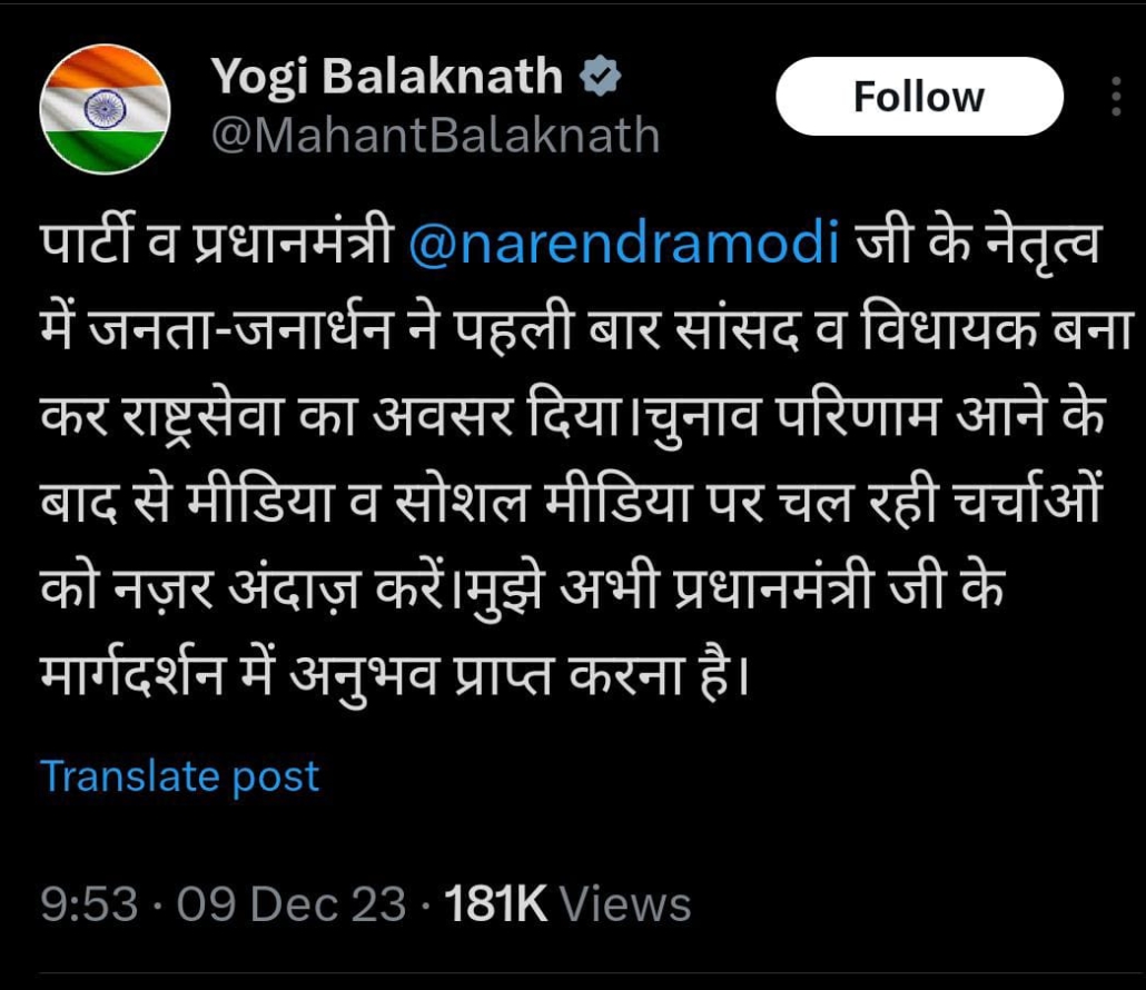 जानकार बालकनाथ के ट्वीट कि अलग-अलग मायने निकाल रहे हैं। कुछ लोगों का कहना है कि योगी सीएम फेस की रेस से बाहर हो गए है। इसलिए यह ट्वीट किया है। जबकि कुछ लोगों का कहना है कि विधायक दल की बैठक के बाद ही पता चलेगा की सीएम कौन बनेगा। फिलहाल बालकनाथ के ट्वीट से राजस्थान में सियासी पारा गर्मा गया है। राजनीतिक विश्लेषकों का कहना है कि बीजीपी का नया सीएम लोकसभा चुनाव के हिसाब से ही बनाया जाएगा। ऐसे में महंत बालकनाथ पर बीजेपी दांव खेलने से हिचकिचा रही है। बीजेपी की मंशा राजस्थान में यूपी की तरह ही एक योगी को सीएम बनाने का दांव चलने की थी लेकिन एक तीर से कई निशाने साधने का सियासी दाव उलटा पड़ सकता है। इसलिए ऐसा माना जा रहा है कि फिलहाल बालकनाथ रेस से बाहर हो गए है। शुक्रवार को बालकनाथ ने दिल्ली में वरिष्ठ नेताओं से मिले थे। शायद उन्हें ऐसे संकेत मिले गए है कि वह सीएम नहीं बन पाएंगे। इसलिए उन्होंने ऐसा ट्वीट जारी किया है।